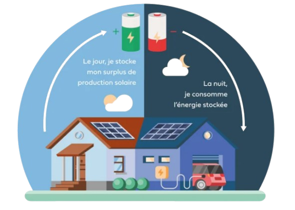 Exemple : si vos panneaux produisent 15 kWh d’énergie sur une journée et que votre maison n’en consomme que 5 kWh, les 10 kWh excédentaires sont stockés dans la batterie. Cette réserve est ensuite utilisée quand vos panneaux ne produisent pas (la nuit ou par mauvais temps). -